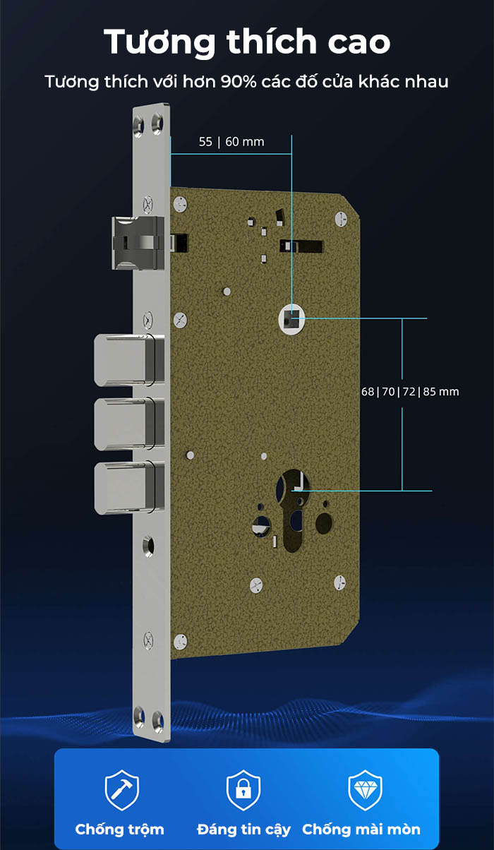 Thân khoá Kaadas Q3 được chế tác từ hợp kim không gỉ, chống cắt phá, chống mài mòn. Tương thích với hơn 90% các loại cửa phổ biến trên thị trường.