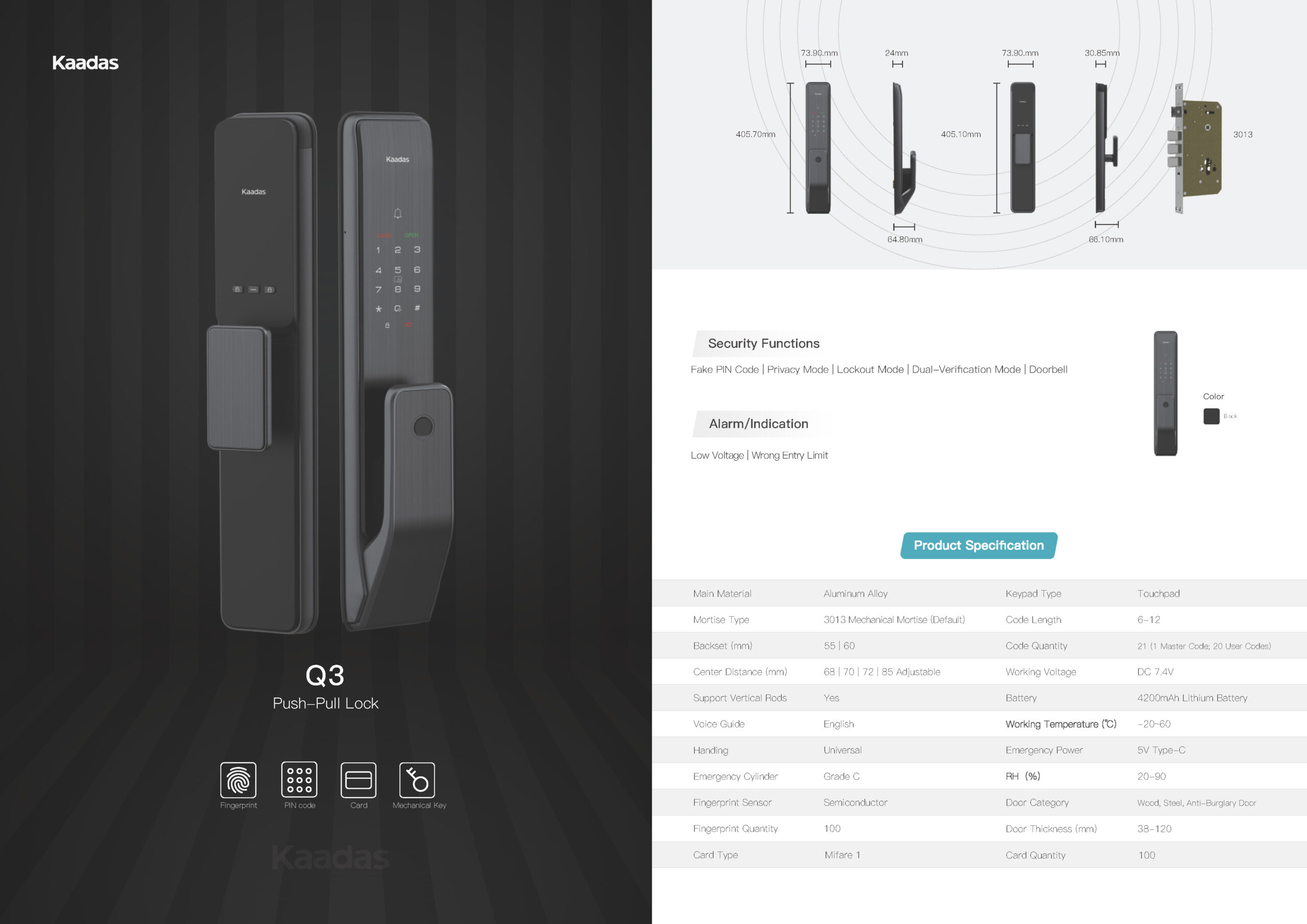 Kích thước này đảm bảo Kaadas Q3 dễ dàng lắp đặt trên hầu hết các loại cửa gỗ, cửa nhôm, cửa thép chống cháy hiện nay.