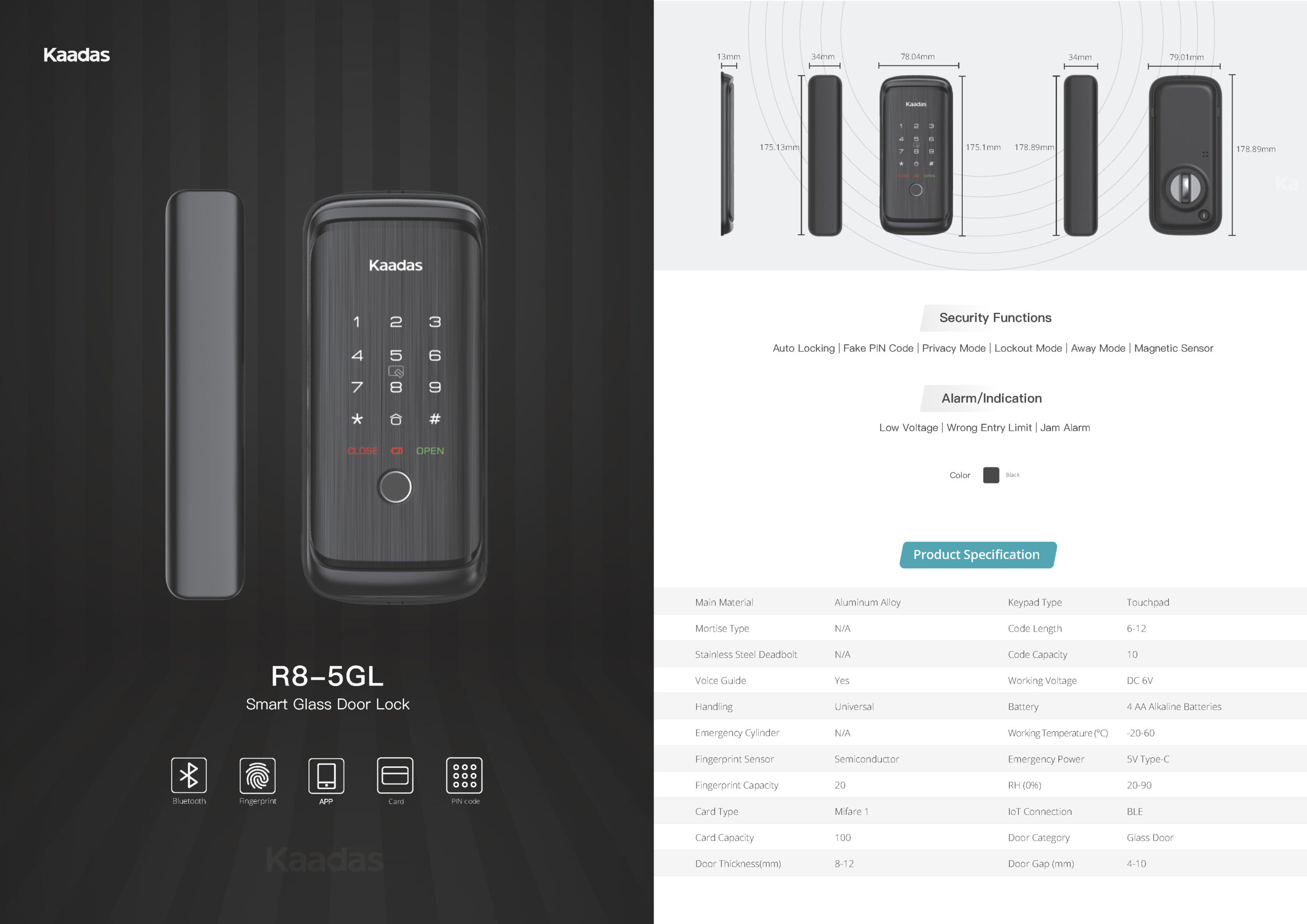 Khoá Điện Tử KAADAS R8-5GL được chế tác bằng hợp kim nhôm nguyên khối phủ lớp sơn tĩnh điện cao cấp, chống bám vân tay và chống trầy xước hiệu quả. Mặt kính cường lực bóng loáng, mang đến vẻ ngoài tinh tế, hiện đại.