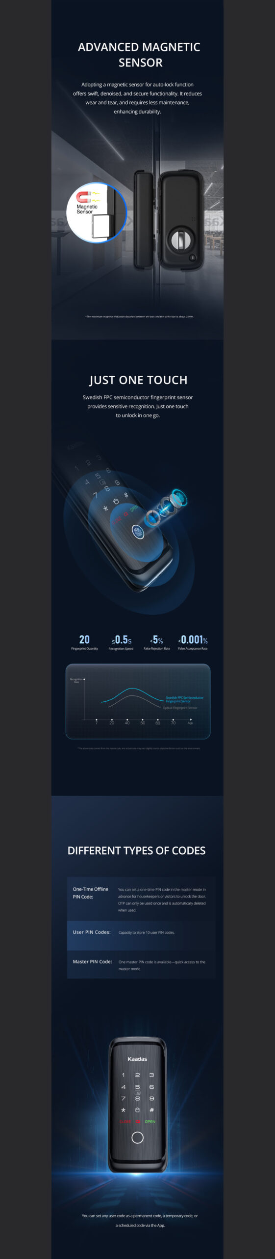 Khoá Điện Tử KAADAS R8-5GL được trang bị cảm biến vân tay bán dẫn FPC Thuỵ Điển, nổi tiếng với độ chính xác và tốc độ xử lý vượt trội. Chỉ cần một chạm nhẹ, khoá sẽ mở trong vòng chưa đến 0.5 giây, độ chính xác gần như tuyệt đối với tỷ lệ sai <0.001%.