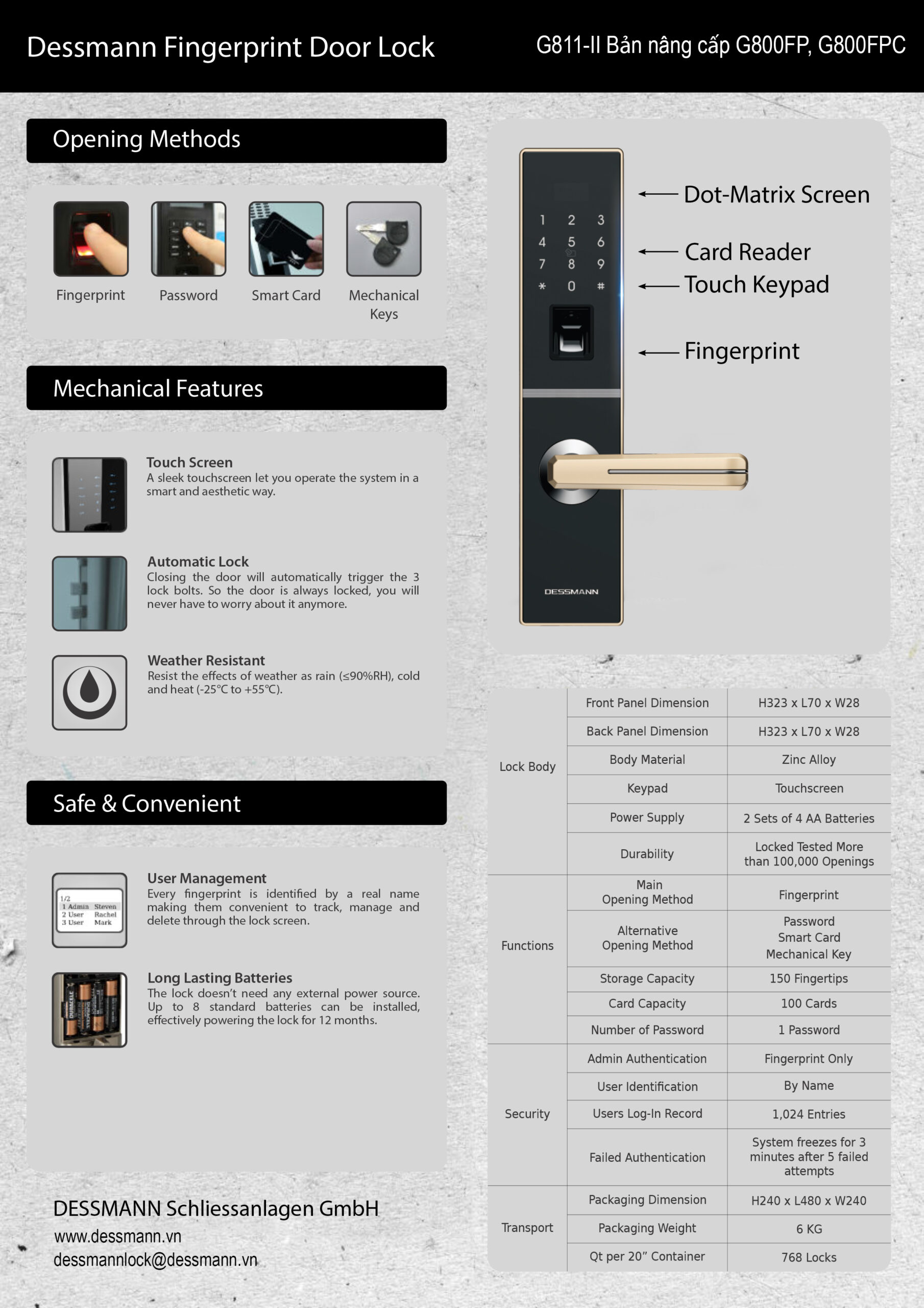 2. Thiết kế và thông số kỹ thuật của khóa vân tay Dessmann G811-II